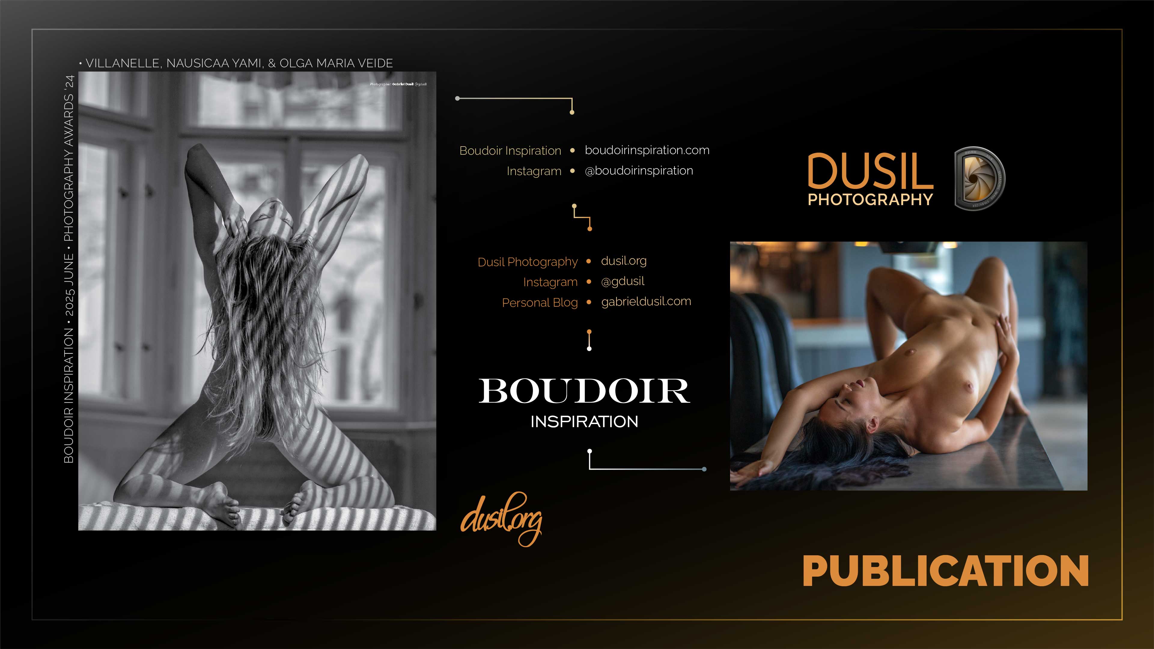 Boudoir Inspiration Magazine, 2024 Photography Awards, Honorable Mention photography, Nausicaa Yami, Olga Maria Veide, Villanelle model, boudoir editorial, professional photographer awards, photography recognition, studio photoshoot, Köpenick Studio, award-winning nude photography, magazine feature 2025, June issue photography, fashion models 2024, glamour portraiture, Prague photographer, European boudoir photography, Boudoir Inspiration feature, Gabriel Dusil photography